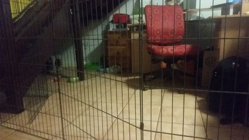 So this is his main area under the stairs, you can see him in the litter box in the corner, his favourite box is the hahn superdry one, but he sepnds time on the grass mat at the front a lot now. I can shut the play pen so he is locked into this area when we aren’t home/supervising or when the untrustworthy dog is hanging around the house.
