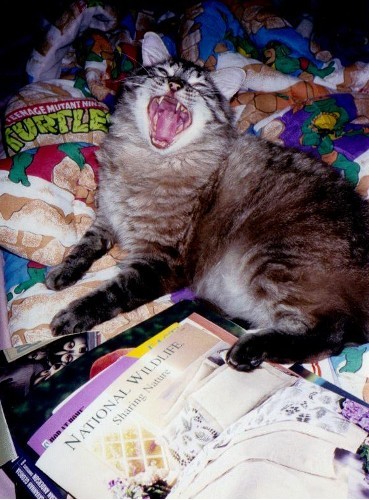 Fuzzy and Tooey remind me of my kitties growing up, Jack and Bug. Jack was a good old man, was born in my mom’s closet when I was 8. When I was about 12, my mom’s boyfriend at the time brought home a little black manx kitten, that was Bug. Him and Jack became instant best buddies. They were always together, and Jack looked out for him like a big old mama cat. Jack was 28 pounds, Bug was maybe 5 lol. Both of them are gone now, Jack died a few years ago, and Bug.. well, my mom’s ex-bf (the one who gave her Bug) refused to let her take him when she went back to BC. He never did tell us what happened to little black Bug.
