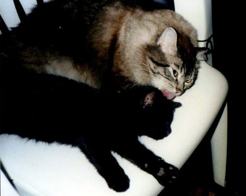 Fuzzy and Mew (Tooey) when she was a kitten. They were joined at the hip. (Looks like it, literally, in this pic!)