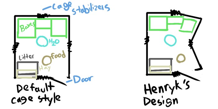 One of our rabbits will constantly try to move anything new/shifted in the enclosure, if you shift stuff around he will immediately return it to it’s proper home. If Henryk hasn’t shifted the cage whilst trying to open the door when it’s closed, I would guess that he prefers his setup and is doing his own version of “cleaning up” to return it to normal.
