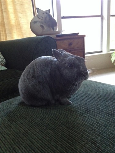 Apollo will bang his dishes bang on 8:30 every night because that’s pellet time, and after being snuggled he sits and cleans himself for a good five minutes as if he’s covered in germs. Nobody goes into the front room without returning with a handful of hay (that’s where his hay bin is kept) for him, and be will dash up and down his condo until it’s stuffed in his litter box.