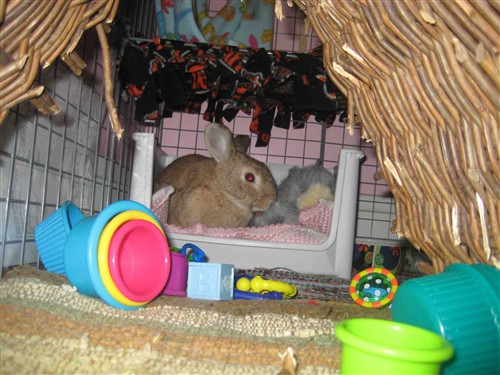 Hammer resting in his cage at the end of the day after all that excitement, snuggling and grooming his Rosebun.