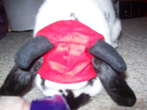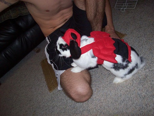 But really, if you guys dress up your buns, just distract them w/ food or what we did, was one petted while one snuch it on!