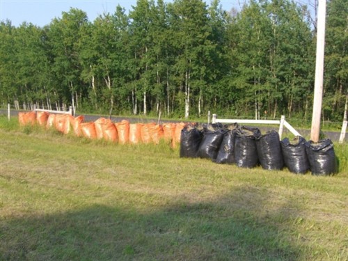 this batch dries up fast. It can cure in a ventilated place, but to transport, I bagged the row of hay that I bought. I was supposed to get enough hay to last one year for my friend’s seven rabbits, another lady’s two, my quartet, to fill some dog beds with, and have a bunch to spare in case… but this 200′ row never ended: in fact I ran out of bags and space before the hay was all picked up. The heat got to me and my pace slowed… it is better to pay a high dollar and buy your hay as you need it…