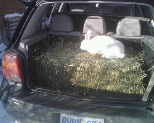 So cute! I love her! You really want to freak out other motorists… just drive around with a bale of hay and bunny in the back of your car!