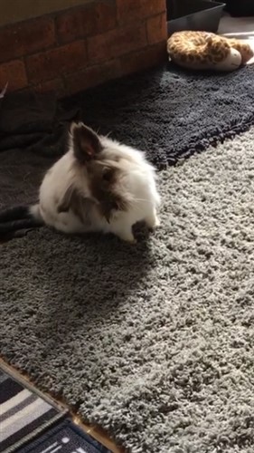 Today, shes like a different bun again, you can tell shes still real poorly but shes eating and awake alot more than she has been, done a couple of wobbly laps around the coffee table and even managed a hop! Shes had two falls (I dont mean fallen off anything just on to her side) today but Ive been calmer and tried to give her more space to correct herself, afterall she needs to relearn her balance and both times she has, in time, and then looked pretty calm, if anything she has this kind of ‘woah did you see that’ look on her face and then goes back to eating parsley.