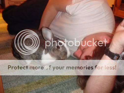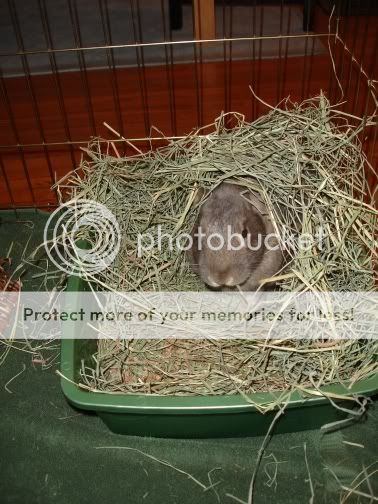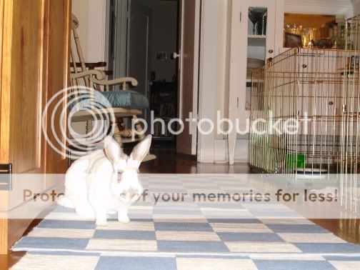 MM, Robbie mostly ignores Lizzy, as she skulks outside his pen snitching his hay (she has plenty of her own hay, but she’d rather antagonize him, the brat!). Occassionally she’ll push her luck, and he’ll nip at her. He’s still sneaky-mean, and I’m afraid to try to re-bond them. Actually, Lizzy (the little bun-slut!), will groom Thumper if he happens past her pen. (Which is shocking, because when they first met, months ago, she flung herself at her cage walls like a FURY trying to kill him!) Then she asks him for a groom, and he looks at her quizzically. It’s like he has no idea what this silly female is on about! And then she gets mad at him and gives him the bunny-butt. So now BF and I are trying to work out the logistics of his moving up here, and if he does, maybe we’ll bond Lizzy and Thumper and let Robbie be a grumpy old bachelor…