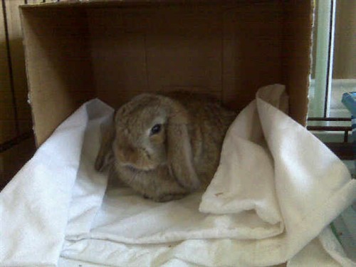 Oh my gosh, how adorable! I’ll agree that it sounds like a guy found a sure way to make a sale. I can’t imagive for a second that someone would actually feed a bunny to a snake. If anyone has ever heard of such a moster, please don’t enlighten me. Freya is a mini lop and since she’s still really little her ears are rather amusing still. Usually one is mostly up and the other is sticking almost straight sideways, sometimes they’ll both be sticking straight out, think flying nun. I guess maybe that’s normal for babies. The moron who sold her says she’s about 7 weeks old right now, and she’s a bit larger than a standard roll of toilet paper when she’s curled up in a little bunny ball. I’m guessing the vet is gonna tell me she’s closer to 2 1/2 to 3 months which is fine by me. The sooner we get spayed, the happier I’ll be. He/she sure is beuatiful, and the ears look much like Freya’s, how cute. I understand why you were so horrified, lucky you to have such an understanding husband. My husband would probably have driven me home bawling, of course I am really really not up to a second bunny but I wouldn’t have cared. Good luck!!!
