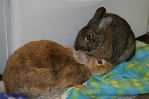 Here are Bonnie and Clyde.  They are bother and sister.  Both about almost 2.  They are Flemish Giant/Holland Lop mixes.  I’m told they came from an accidental litter at a breeder.  I guess they got to close!  They aren’t too big.  Clyde is a little bigger than Rhine was and I think Bonnie is about the same size.  They are weightier than Rhine though.  I think they’re about 6&8lbs.  They want me to keep them for a few weeks to see how we like them.  After that we’ll decide if we want to adopt them or foster them.