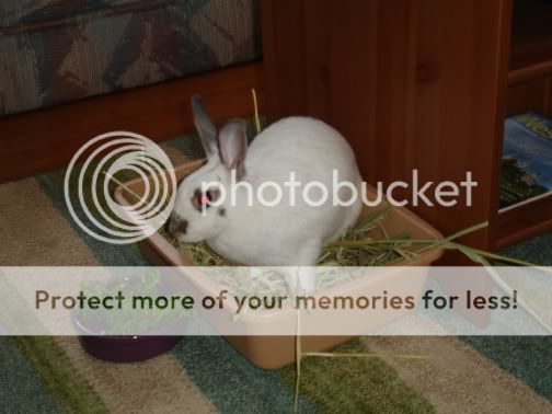 Miss Lizzy is a very fastidious bun, and wants everything in it’s proper place. She sits in the middle of her box, picks out each individual strand that offends her, and chucks it out (onto my floor, of course!). Then she spins around in a circle, and with one click of her teeth, trims each strand that pokes over the edge of the litter box, until everything fits just-so! Until she jumps out, and kicks the hay out of place…I have seen her skid to a hault in the midst of a Bunny 500 lap when she hits the litter box, click-click-click the offending overhanging hay with her teeth (again, onto my floor!), and then continue the race!