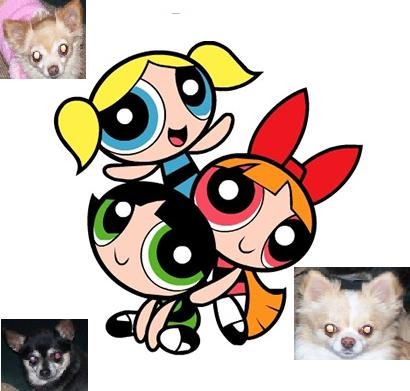 But I have my costume idea for next Halloween! I will take my 3 chihuahuas (yeah, I might be known as the Chihuahua lady here, but I personally am only responsible for the three seen in the following photo!), and dress them up as the POWERPUFF GIRLS. Remember them? Well after you compare the pictures I’m sure you’ll understand why they kind of totally fit. The really funny thing is that their personalities match too! And yes, yes I will dress up as Professor Utonium, or worse, make my boyfriend (don’t tell him!).