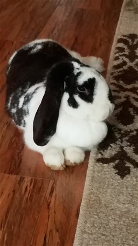 I’m not sure why the pic isn’t showing cause its showing through my end. He has long ears that hang to the side. And is black and white with dark brown eyes. He doesn’t seem to be overweight although I dont know. He actually feels really boney in his back. Just seems to have a huge dewlap as I had mentioned earlier. I have been feeding him carrots and romaine lettuce the last two days and as of yesterday started him on Menu rabbit food. I was reading that Timothy grass hay is 80% of what they should be eating. How much Timothy grass, rabbit food and veggies should I be feeding per day? He doesnt seek to be drinking much water although hes been eating alot of lettuce which contains water.
