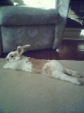 If my bunny were human, she would go to work everyday as a Stand-up comedian and spend most of her earnings of said profession on giant boxes of raisins. On weekends, she would spend lots of time practicing her sport of couch-back climbing, for which she’s won many medals. Of course, everyone needs to relax and she does this best by chillin on the upper deck and indulging in her guilty pleasure of thumping behind the couch.