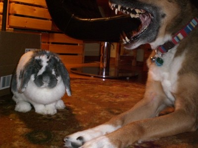 If my bunny were human, she would go to work everyday as a Dog Tamer and spend most of her earnings of said profession on organic blueberries. On weekends, she would spend lots of time practicing her sport of NIC cube chewing, for which she’s won many medals. Of course, everyone needs to relax and she does this best by canoodling the dog and indulging in her guilty pleasure of raisins.