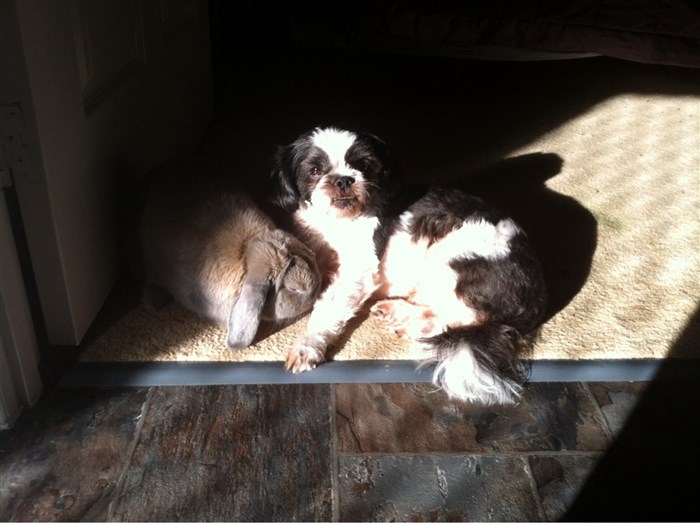 Would Bumpy be happier? He is happy. He hops around and follows the dogs and hops up in the chair beside me or, runs up and bumps me and sit by my feet and licks my legs. He grooms me at least an hour throughout the day. He loves head pets. But sometimes (and I may be projecting my own emotions) he seems lonely. Like the dogs ignore him almost always, and he’ll go bumping along and sit beside them. Sometimes they get up and move away, leaving him sitting there. He may flop over shortly after, or hop away and find something else to do… just sometimes I look at him sitting all alone and wonder what he’s thinking, or maybe he’s sad the dogs don’t groom him.