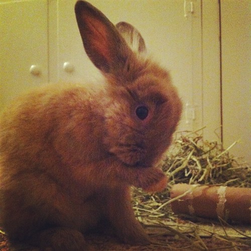 Some of her characteristics remind me of a Lop, her head shape particularly. I don’t think she has any (noticeable) dwarf in her. And then of course the longer fur looks like a Lionhead. She may have Lop and Lionhead in her, half and half, or maybe only a quarter Lop… As she gets older her fur may change too.