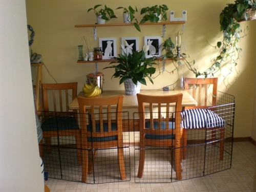 Here’s a picture of my cage set up. Eventually I hope to remove the pen and use it to block off the dining room and kitchen, so he can run around both rooms. For now he won’t even venture into the pen