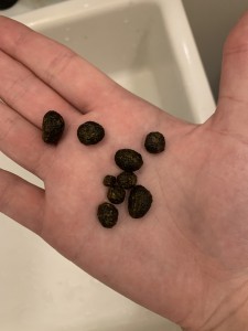 In October 2020 I rescued a bunny who was being given away on craigslist. She is most likely a florida white, she’s 4lbs and is probably about a year old. She had minor injuries which healed on their own and she has always been a very calm and loving bunny. When we first got her she had very regular green poops but in december her poops suddenly became dark brown like in the photo. I thought this might be because of a change in brand of hay (always timothy hay) but after going back to the brand we had been using before, her poops stayed dark. I also tried cutting down on veggies because I read dark poop can mean she’s getting too much protein (I feed about a cup of greens a day). I was beginning to just accept she has dark poop now but yesterday I noticed the size of her poops is irregular some are very small and some are oval shaped almost, this can be seen in the photo… this is very worrying to me I read that it could be megacolon but she has never had diarrhea or mucus in her poop.