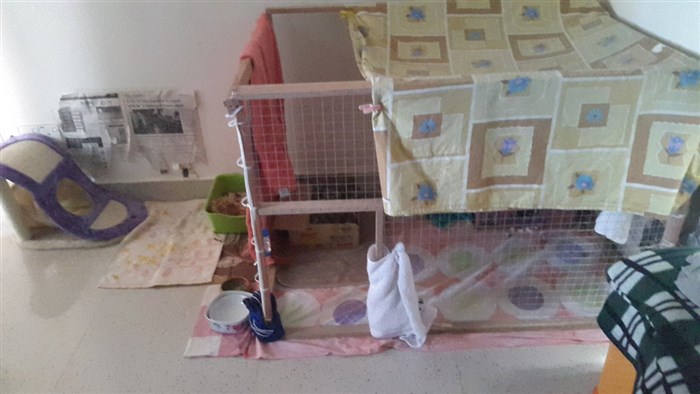 So since the narrow place in between the bed and the wasn’t safe I shifted all her stuff to a tray I made out of box and place a another box so that she could make her nest there.