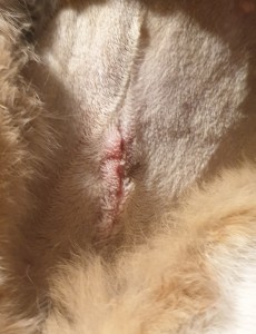 I had my girl bun spayed in November last year, She started to eat some things about an hour after we came home, but I still syringed her food once before bedtime. I got 5 days worth of meloxicam for her. I asked another person to hold her so I could check her incision. This is how it looked the day after the spay: