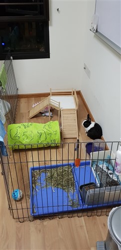 This pen is in a room where I am working from but nowadays I have to go out to meet my clients for hours on end so like from 3 pm to 10 pm at night I am not around. I am thinking of getting another bun for him but when I brought up the issue of getting another bun, my mum broke down and cried (due to depression).