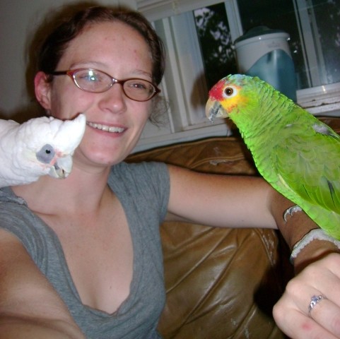 Big?? Lol, if you think the tiels and conures are big birds then you’d think most of the birds I work with out at the rescue are HUGE! The amazons and cockatoos are much bigger then the conures are. I’m a mess in this picture so please ignore me but this should give you a good idea of how big the toos and zons are.