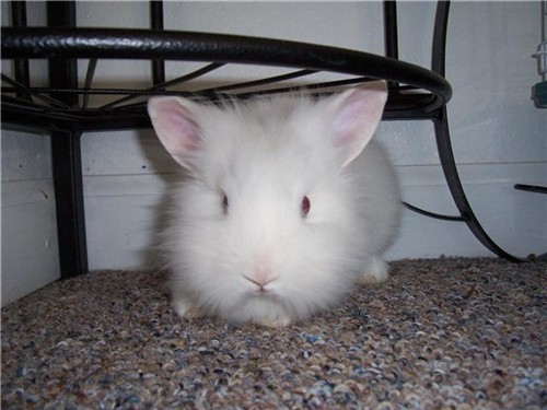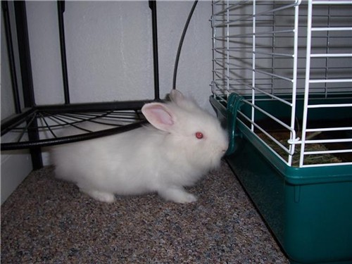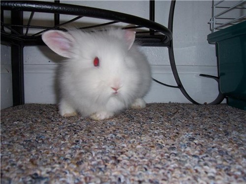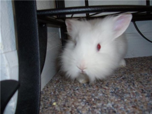 well i guess i am officially a crazy rabbit lady!!  me and my husband went to a pet store today to get some feeder fish and some willow tunnels.  well, when we were there we saw a fluffy white lion head baby with blue eyes.  i think we both fell in love.  he usually doesnt show interest in any of the bunnies.  he thinks of them as being mine.  he was so excited over this baby that i just had to get it.  he says he is going to play with and pet this bunny all day lol.  so funny to hear him talk like that!  so i guess this makes number 4.  the lady at the store says its a girl, but we will have to double check of course.  i think she is about 3 months old judging from her size.  there was also no food or water in her cage or litter box.  poor baby.  i didnt think i was going to be coming home with another rabbit today, esp bc hubby wanted one!  i wanted to name her sammy for samantha but when he picked up the kids from school he told them her name was zoey.  what a sneak!!  do i wait to introduce any of my other rabbits until after she is spayed?  or do i do it now while she is a baby??  heres some pics.  it is normal for white bunnies to have blue eyes?