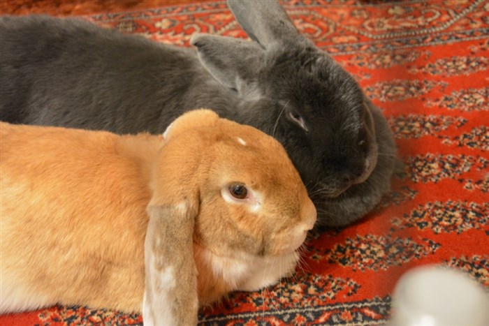 They are an odd pair, for sure. But it’s cute how they like to hang out together. Mosby got scared on New Year’s Eve when the fireworks started going off, and he went to hide in the bunny cage. I guess he figured his big bunny brother would keep him safe.