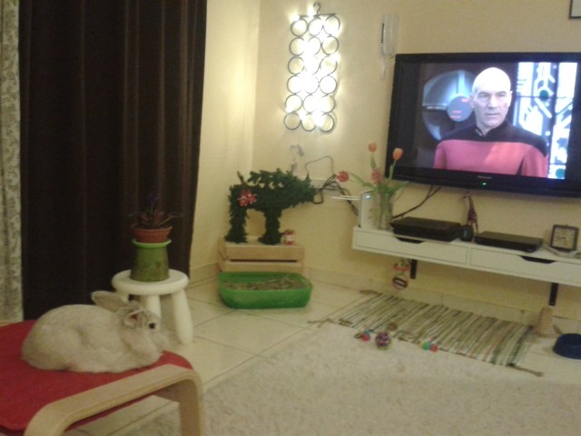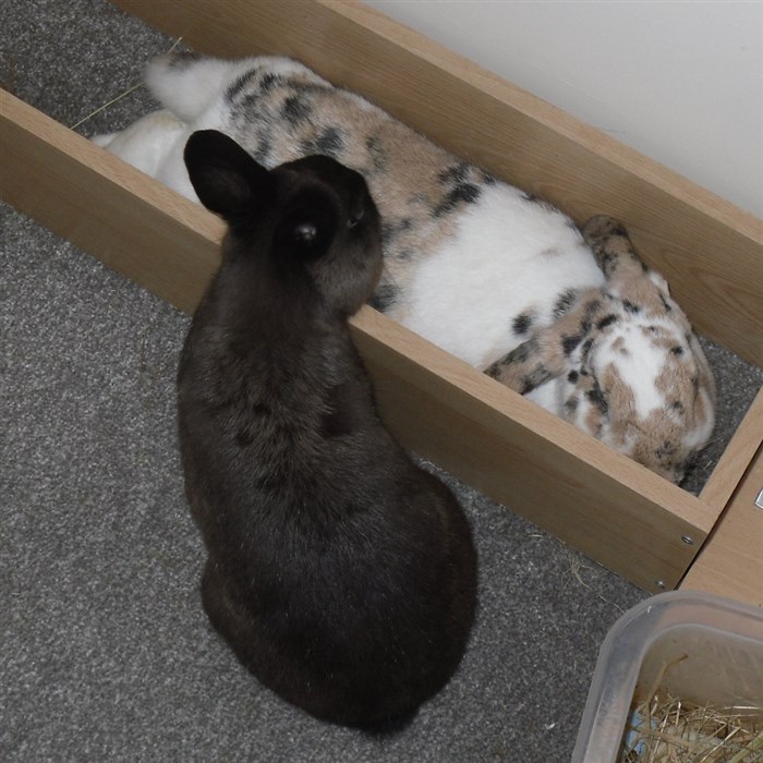 My Bam is sometimes in his hide-box and sometimes on top of it and sometimes on his IKEA-bed or on his bunk bed. My guess is bunnies lie out in the open when they’re feeling social.