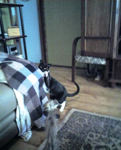Jack, Tanger did that for such a long time!! He still does it randomly but he used to do that ALL the time. Bite you right in the back and go binkying away! It hurt so freaking bad too!!!!!