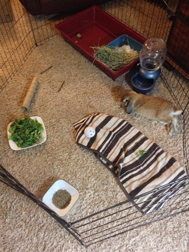 Made him a plate full of different veggies, gave him an alfalfa cube, some Oxbow pellets, and lots of hay. Tried to entice him with some canned pumpkin. Nothing yet, no drinking either. She said to give him some pain meds tonight – debating on when a good time would be to do it. They didn’t specify a time and stupid me forgot to ask. Poor little man has had a rough week though! Went from being in his home, to being kicked out of his home and brought to the shelter, to getting neutered, and then brought to a new home! He’s probably pretty overwhelmed.