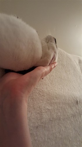 Here’s a pic of Theo cuddling/begging for pets on the sofa with me: