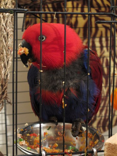 Having said all that, here’s a pic of her messy face after eating. She wipes it off of her beak onto the bars and then eats it off the bars later, lol. Regarding her neck, that’s how she was when I found her. She has plucked a little more since then exposing a little bit of skin, but she’s also letting some grow in so we’ll see how that progresses. I’m hoping it will improve the longer she’s here and once she gets a larger cage. She was obviously a plucker before, but it seemed pretty healthy in terms of growth so it makes me sad that it’s only gotten worse since she got here.