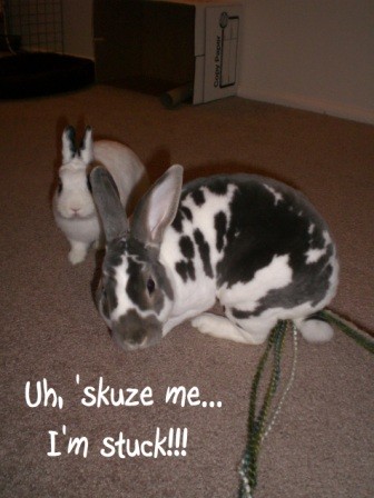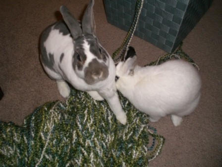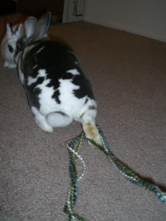 Anyway, I was knitting tonight, on the floor, and the bunnies came to join me.  I bought a couple new “knitting basket”s to hold my projects when I’m not knitting and to hold the skiens of yarn when I’m working, so they don’t go racing across the floor when I pull out some more length.  So, of course, the bunnies had to come over and sniff the new things!