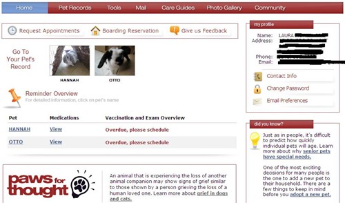 Here’s a screenshot of their “Pet Portal”: (I’m always overdue for exams because they recommend every 6 months and I only come in once a year – I wish I could change that because the email reminders get annoying after a while)