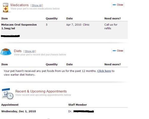 And this is on the “Pet Records” page for Hannah, where I can see what meds they’ve given me and when my next appointment is (we’re going in tonight actually)