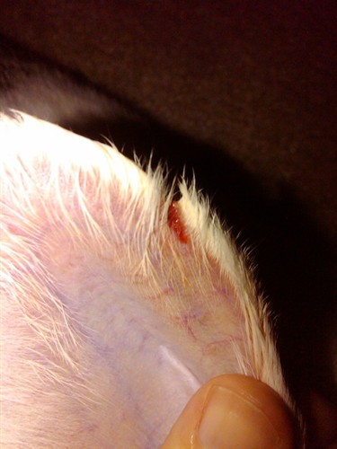 To me it seems too small to put her through stitches, but she managed to either reopen it or make it a little worse last night while playing. It’s a little hard to tell with the scab now. If it bleeds again I might take her to the vet after work tomorrow to see what they say. I don’t imagine there’s a bunny bandage but I don’t want it to keep opening.
