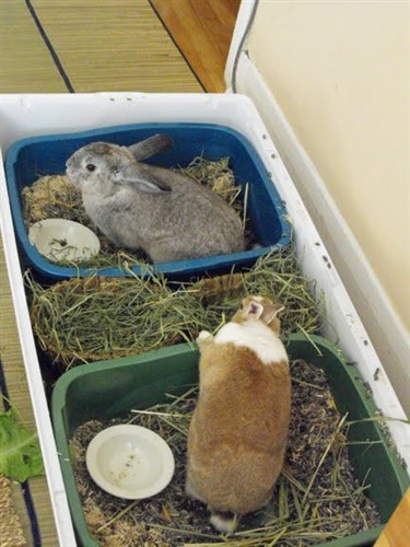 Rabbits LIKE to eat and poo/pee at the same time – which is why in my picture you see them with the hay and litter very close by. It is natural for them to be sitting there, eating hay and pooping. This is why I now have the hay sitting in the front of the litter boxes. They just like to sit there and munch away!