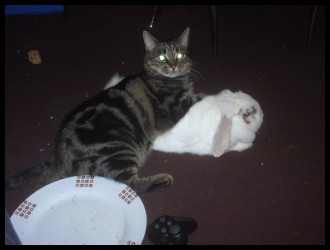 LOL They have become friends very quickly! we have only had that bun about 2weeks lol she washes him!