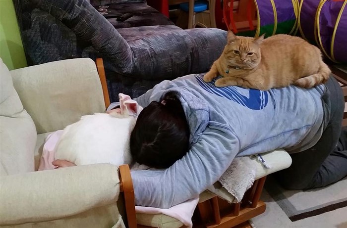 Cinder decided that she was sleepy, and I suppose I was the closest nap partner, haha. Someone is a little snuggle bunny after all.