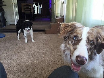 My 2 border collies. They are both Merle. Arthur is Blue Merle. You can see the little spots on his legs. Of his litter, I picked the most standard looking. I had him since 8 weeks. He is a total sweetie, but wary of strangers. Rebel is a red merle. Also a love bug, but Rebel lives up to his name. Super energetic, stubborn, always testing the limits. Both male, neutered.