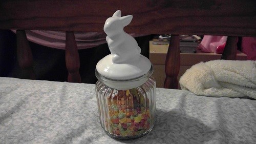 I almost bought a mason jar with a bunny topper too, but I controlled myself to the two bunny salad plates I bought. Some sheer miracle.