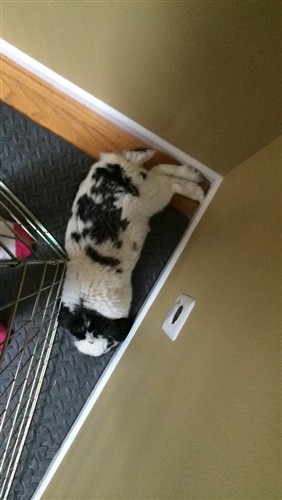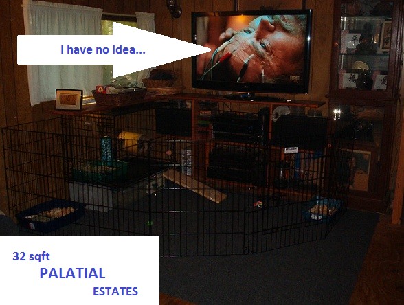 So… my sister-in-law is almost here.  She’s driving up from Tennessee to visit.  Well of course this means you have to clean up… and Bumpy has been slipping a little on the litterbox, I think it’s because he’s pretty much free-roam and even though most of the time he goes back to his pen to pee.. he just recently started peeing beside the box on the opposite side of the fence.  SOOO… cleaning up anyway… time to get rid of any carpet that had accidents on them and downsize his pen.  I needed to reclaim some space.