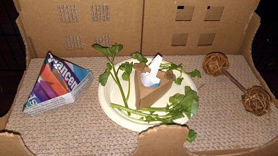 Today I decided to see what Bleu would do if I gave her an icecube. First I handed it to her and she didn’t seem interested. Put it on a paper plate and she went crazy with it. Kern didn’t care about his, nose bumped it and hopped away