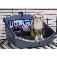 Finally, you can buy a litter pan that comes with a screw mechanism attached, which I use, that goes outside the bars and hooks onto the pan so it stays put. It’s a corner pan. I got it at a petshop. Also, if you just want a plain litter pan, poke a hole into the side of it, not far from the top, sand down the rough edges of the hole for safety, and run a tie through it. Hook the tie around the outside of the cage bar to hold it in place and to make it available for you to untie when it’s time to clean.
