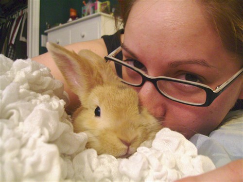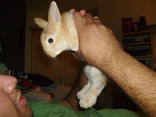 Anyones rabbits have wierd fascinations? India loves to clean on her dads hair. Hes got short thick hair hair and she could lick it for hours. Sometimes she tries to chew it out. She gets pretty agressive with him, tries to pull his head down so she has better access to the hair. Very odd bun! But so much personality!
