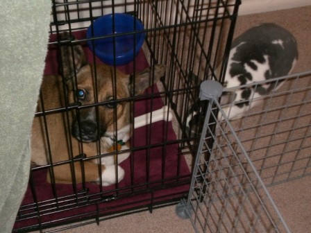 When dog was at the shelter, after I picked him, I brought the bunnies in to meet him.  Neither cared one bit about him.  Both just sat there and munched their hay.  Dog was interested but didn’t strain towards them or try to grab one or anything – definitely a better candidate for this than say my parent’s lab!   At home I’ve done one quick intro session with Leroy and dog so far.  (I figured I’d do one bun and then introduce the other so I don’t overwhelm Dog, and since Leroy seemed to be a bit braver, he gets to be first).  Leroy was MOST interested in him – sniffing all around and checking things out – but not fearful.  Dog was in his crate, just to make sure nothing happened the first time out, but he paid more attention to me than to Leroy!  You can see in these pictures, he’s looking at the camera/me rather than even bothering with the bunny.