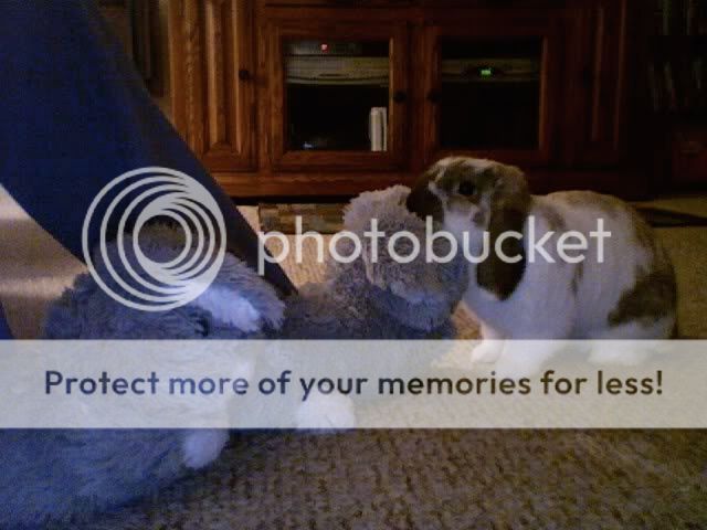 I posted before that Archie was humping my bunny slippers…it stopped for a little while but the other day he came out and humped them a bit (rotating between the two…although he prefers the right bunny foot).  My husband was laughing at me dragging my bun that was clinging onto my slipper into the living room   He loves to clean their ears and if I don’t stay still he puts his paws on their head to try to keep them still so he can clean them and follow or cling onto them in order to clean them!     So cute!  I wonder if his previous owner had another bun that he was with….  I think he’d get along with a girl bunny.  Do you have to seperate 2 buns or can you leave them in one cage?  ( I know at first you wouldn’t do that in order to bond them)