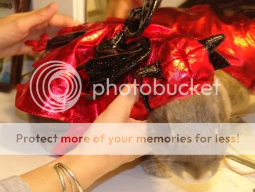 Very cute. I bet Robbie never thought he’d wind up as a house rabbit being forced into an adorable devil costume, lol…