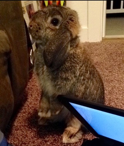 My little girl is a beautiful chestnut agouti mini lop. And she is completely wonderful. She’s only about three months old. She’s very energetic, loving, and tolerant of my shenanigans. She’s mostly free roam (she does have a big ol’ puppy pen for night time), and very well behaved. She hasn’t gone for any of my wires (yet?). To my surprise, she’s even got the litter box down already, after only a couple weeks and hardly any effort on my part. The only issue I’ve had was a few weeks ago when I got a new couch, when she suddenly became so determined to get behind/under it that she was going at the carpet just hoping it’d give. That calmed down when I provided another big box for her to sit in next to the couch.